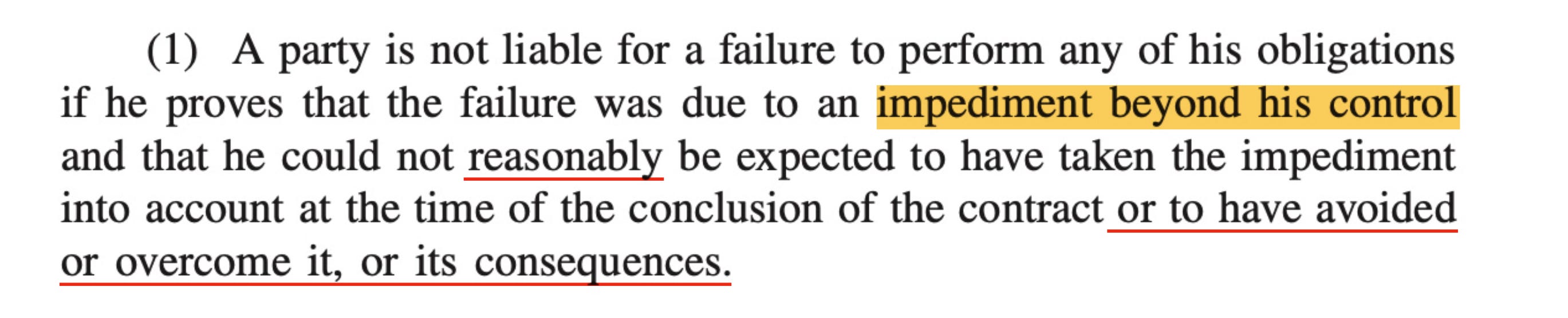 ⮕ If the claim is accepted, the invoking party is excused from performing and from civil liability (e.g., paying damages) with regard to any suspension, deferral, or delay.